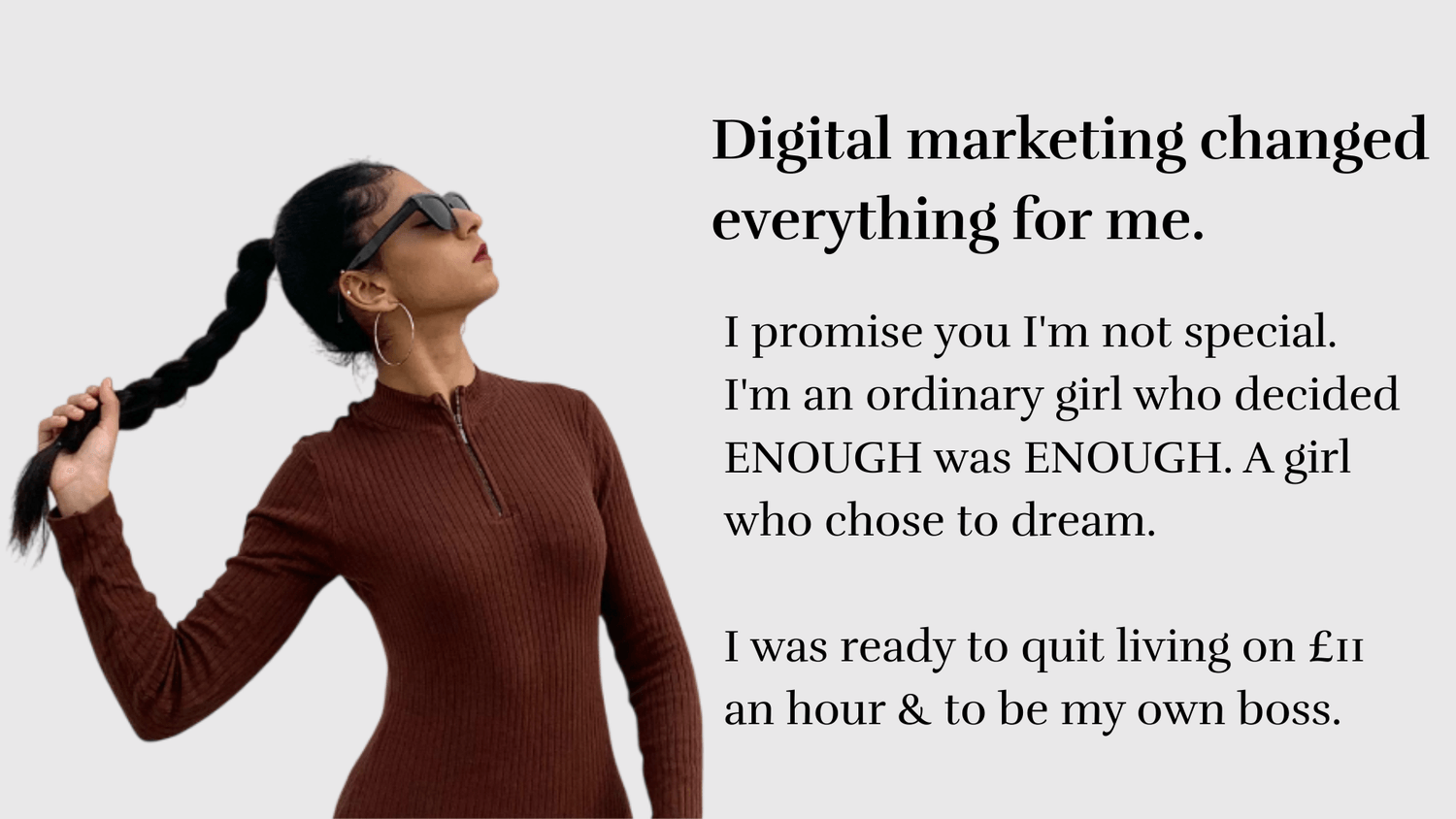 One day, I stumbled upon a girl doing digital marketing and saw how she was making money online with zero experience, and I thought to myself, “If she can do it, why can't I?”