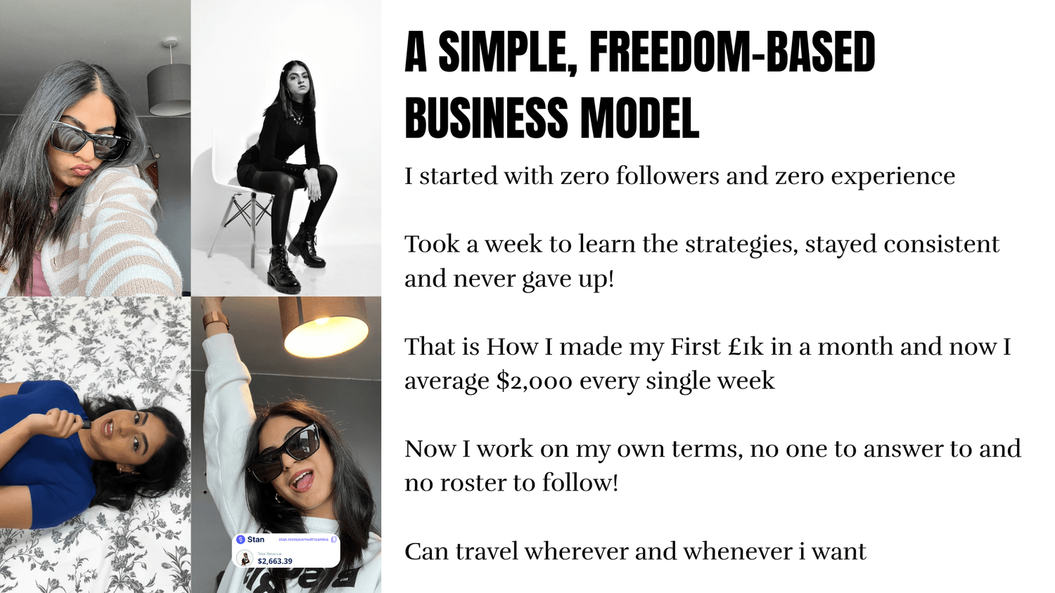 You can start with zero experience. You don't need to be tech-savvy. You don't even need to show your face if you don't want to. You just need to be willing to learn and take action.